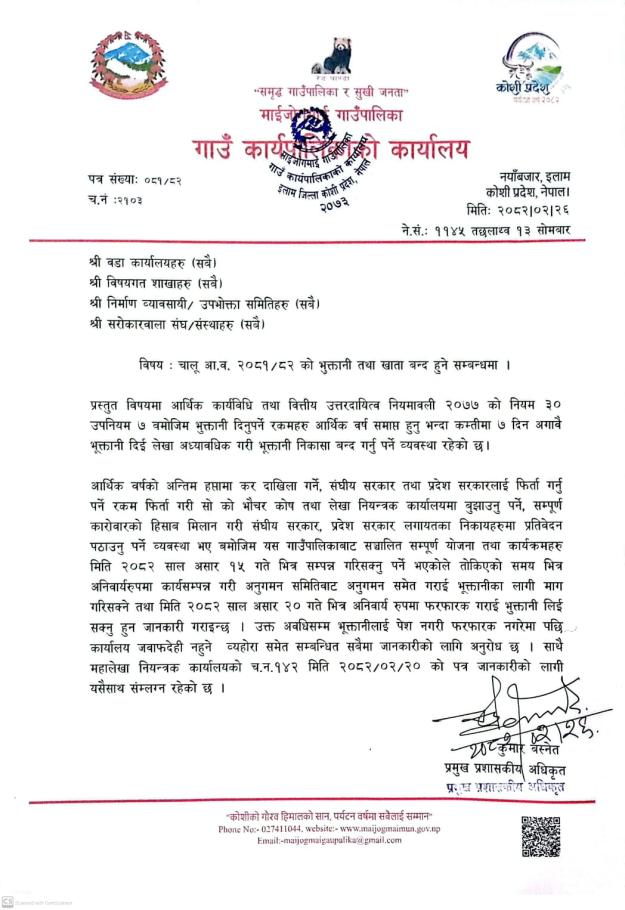 चालू आ. व. २०८१/०८२ को भुक्तानी तथा खाता बन्द हुने सम्बन्धमा ।