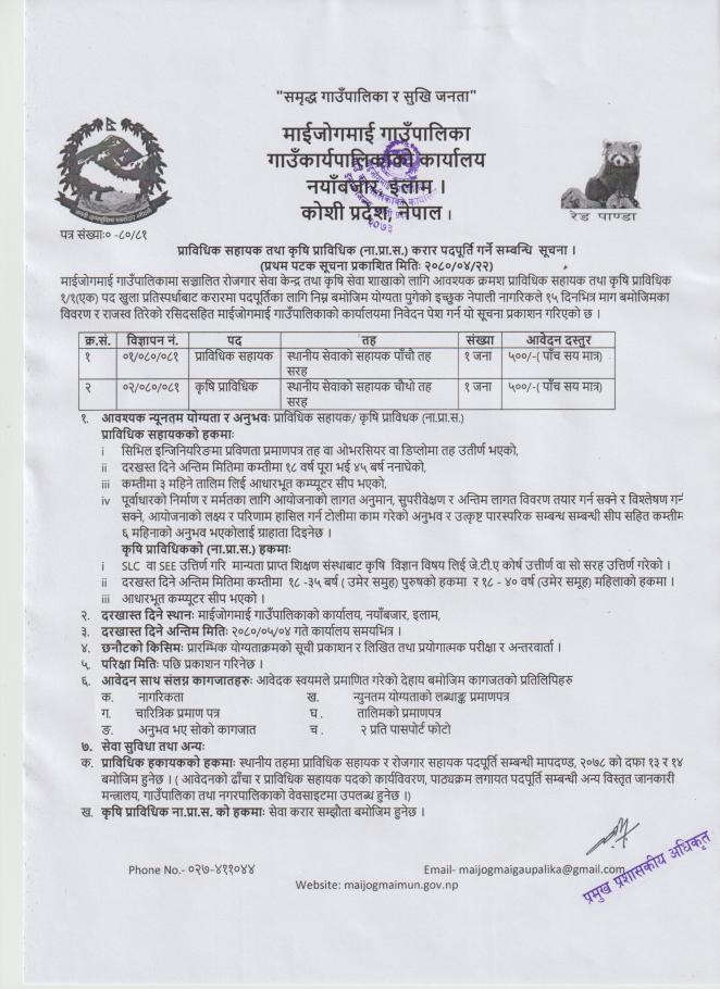 प्राविधिक सहायक तथा कृषि प्राविधिक (ना.प्रा.स.) करार पदपूर्ति गर्ने सम्बन्धि सूचना ।